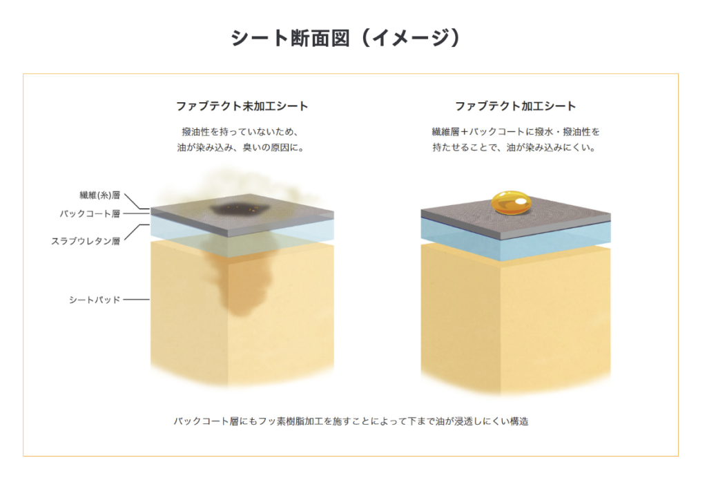 FABTECTが採用されたシートなら、液体をサッと拭き取るだけで除去できます。