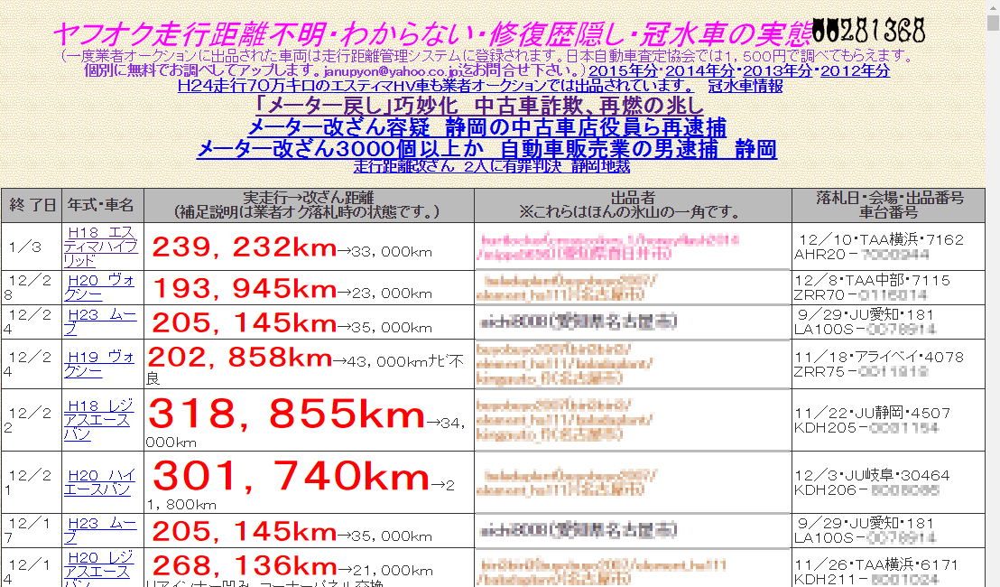 法人などではなく一個人様のWEBサイトだと思いますが、ヤフオクに出品されている走行距離改ざん車を尽く暴いているサイトです。